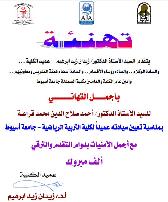 كلية الصيدلة تتقدم بخالص التهنئة للسيد الأستاذ الدكتور/ أحمد صلاح الدين محمد قراعة بمناسبة تعيين سيادته عميداً لكلية التربية الرياضية - جامعة أسيوط. 26 يناير 2015 كلية الصيدلة تتقدم بخالص التهنئة للسيد الأستاذ الدكتور/ أحمد صلاح الدين محمد قراعة بمناسبة تعيين سيادته عميداً لكلية التربية الرياضية - جامعة أسيوط.