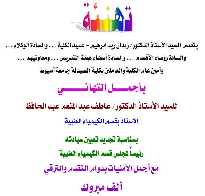 كلية الصيدلة تتقدم بخالص التهنئة للسيد الأستاذ الدكتور/ عاطف عبد المنعم عبد الحافظ بمناسبة تجديد تعيين سيادته رئيساً لمجلس قسم الكيمياء الطبية. 11 سبتمبر 2014 كلية الصيدلة تتقدم بخالص التهنئة للسيد الأستاذ الدكتور/ عاطف عبد المنعم عبد الحافظ بمناسبة تجديد تعيين سيادته رئيساً لمجلس قسم الكيمياء الطبية.