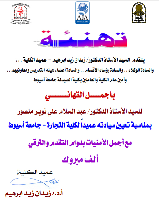 كلية الصيدلة تتقدم بخالص التهنئة للسيد الأستاذ الدكتور/ عبد السلام علي نوير منصور بمناسبة تعيين سيادته عميداً لكلية التجارة - جامعة أسيوط.