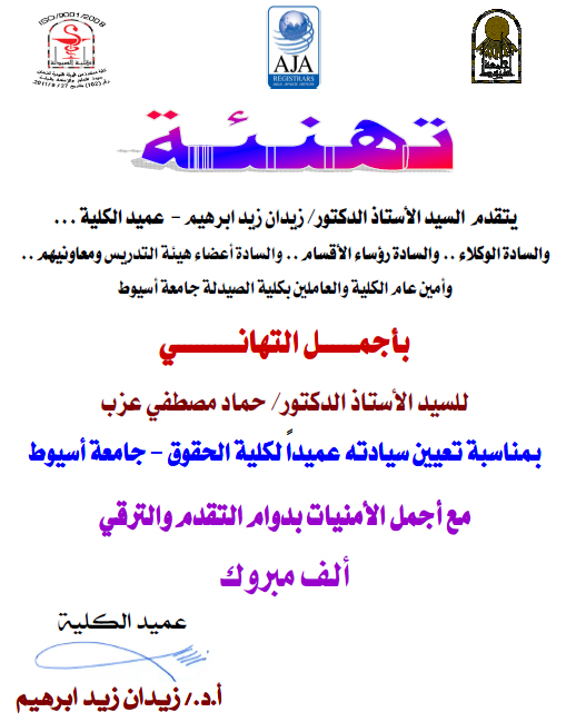 كلية الصيدلة تتقدم بخالص التهنئة للسيد الأستاذ الدكتور/ حماد مصطفي عزب بمناسبة تعيين سيادته عميداً لكلية الحقوق - جامعة أسيوط. 10 فبراير 2015 كلية الصيدلة تتقدم بخالص التهنئة للسيد الأستاذ الدكتور/ حماد مصطفي عزب بمناسبة تعيين سيادته عميداً لكلية الحقوق - جامعة أسيوط.