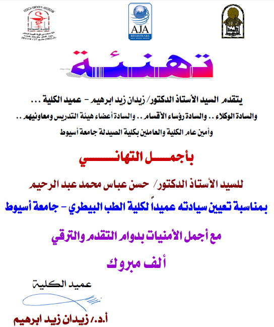 كلية الصيدلة تتقدم بخالص التهنئة للسيد الأستاذ الدكتور/ حسن عباس محمد عبد الرحيم بمناسبة تعيين سيادته عميداً لكلية الطب البيطري - جامعة أسيوط. 10 فبراير 2015 كلية الصيدلة تتقدم بخالص التهنئة للسيد الأستاذ الدكتور/ حسن عباس محمد عبد الرحيم بمناسبة تعيين سيادته عميداً لكلية الطب البيطري - جامعة أسيوط.