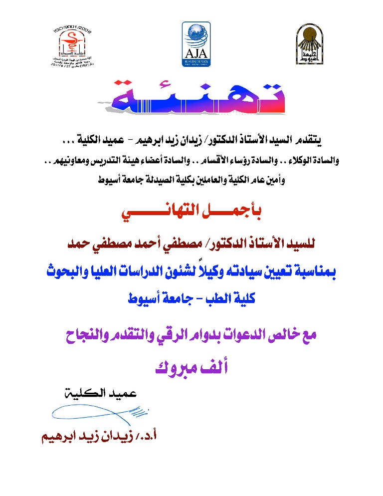 كلية الصيدلة تتقدم بخالص التهنئة للسيد الأستاذ الدكتور/ مصطفي أحمد مصطفي حمد بمناسبة تعيين سيادته وكيلاً لشئون الدراسات العليا والبحوث - كلية الطب - جامعة أسيوط.