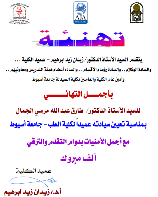 كلية الصيدلة تتقدم بخالص التهنئة للسيد الأستاذ الدكتور/ طارق عبد الله مرسي الجمال بمناسبة تعيين سيادته عميداً لكلية الطب - جامعة أسيوط. 10 فبراير 2015 كلية الصيدلة تتقدم بخالص التهنئة للسيد الأستاذ الدكتور/ طارق عبد الله مرسي الجمال بمناسبة تعيين سيادته عميداً لكلية الطب - جامعة أسيوط.