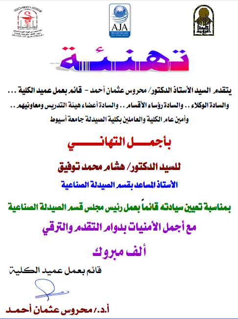 كلية الصيدلة تتقدم بخالص التهنئة للسيد الدكتور/ هشام محمد توفيق بمناسبة تعيين سيادته قائماً بعمل رئيس مجلس قسم الصيدلة الصناعية بالكلية.