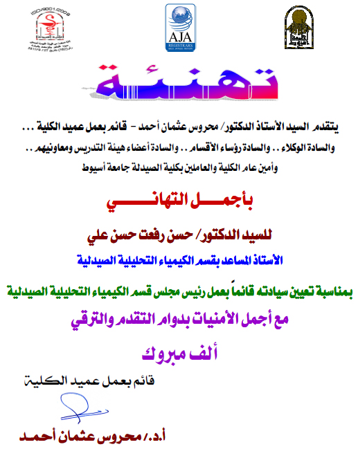 كلية الصيدلة تتقدم بخالص التهنئة للسيد الدكتور/ حسن رفعت حسن علي بمناسبة تعيين سيادته قائماً بعمل رئيس مجلس قسم الكيمياء التحليلية الصيدلية بالكلية. 22 أغسطس 2016 كلية الصيدلة تتقدم بخالص التهنئة للسيد الدكتور/ حسن رفعت حسن علي بمناسبة تعيين سيادته قائماً بعمل رئيس مجلس قسم الكيمياء التحليلية الصيدلية بالكلية.
