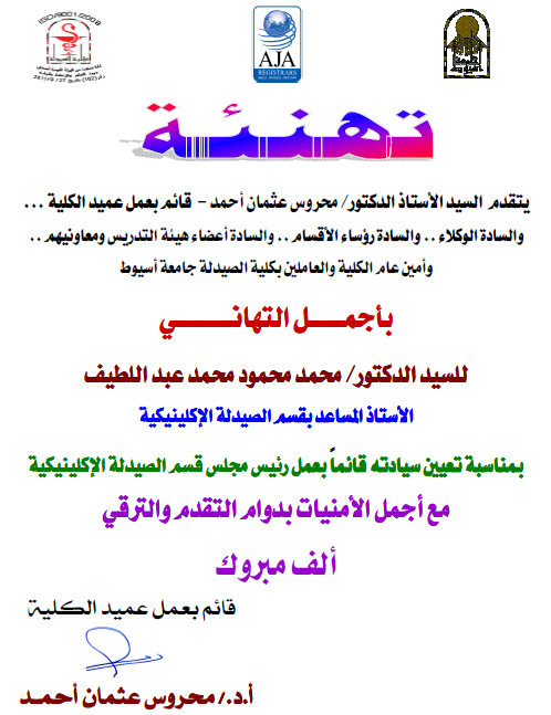 كلية الصيدلة تتقدم بخالص التهنئة للسيد الدكتور/ محمد محمود محمد عبد اللطيف بمناسبة تعيين سيادته قائماً بعمل رئيس مجلس قسم الصيدلة الإكلينيكية بالكلية. 4 أكتوبر 2016 كلية الصيدلة تتقدم بخالص التهنئة للسيد الدكتور/ محمد محمود محمد عبد اللطيف بمناسبة تعيين سيادته قائماً بعمل رئيس مجلس قسم الصيدلة الإكلينيكية بالكلية.