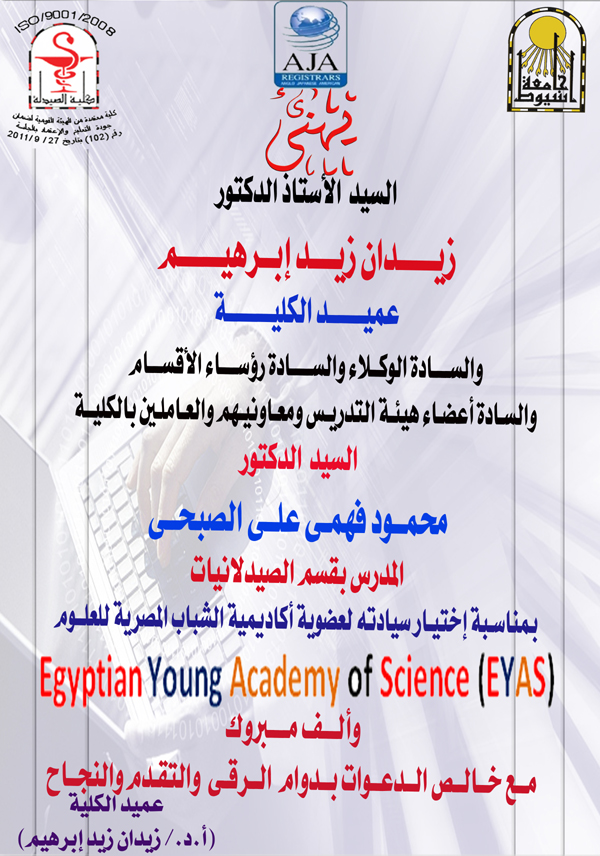 كلية الصيدلة تتقدم بخالص التهنئة للسيد الدكتور/ محمود فهمي علي الصبحي بمناسبة اختيار سيادته عضواً بأكاديمية الشباب المصرية للعلوم Egyptian Young Academy of Science - EYAS.