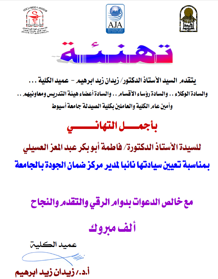 كلية الصيدلة تتقدم بخالص التهنئة للسيدة الأستاذ الدكتورة/ فاطمة أبو بكر عبد المعز العسيلي بمناسبة تعيين سيادتها نائباً لمدير مركز ضمان الجودة بالجامعة.