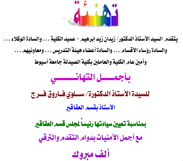 كلية الصيدلة تتقدم بخالص التهنئة للسيدة الأستاذ الدكتورة/ سلوي فاروق فرج بمناسبة تعيين سيادتها رئيساً لمجلس قسم العقاقير. 2 أغسطس 2014 كلية الصيدلة تتقدم بخالص التهنئة للسيدة الأستاذ الدكتورة/ سلوي فاروق فرج بمناسبة تعيين سيادتها رئيساً لمجلس قسم العقاقير.