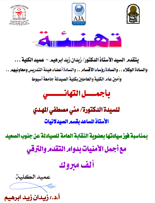 كلية الصيدلة تتقدم بخالص التهنئة للسيدة الدكتورة/ مني مصطفي المهـدي بمناسبة بمناسبة فوز سيادتها بعضوية النقابة العامة للصيادلة عن جنوب الصعيد. 8 مارس 2015 كلية الصيدلة تتقدم بخالص التهنئة للسيدة الدكتورة/ مني مصطفي المهـدي بمناسبة بمناسبة فوز سيادتها بعضوية النقابة العامة للصيادلة عن جنوب الصعيد.