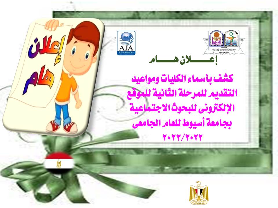 كشف بأسماء الكليات ومواعيد التقديم للمرحلة الثانية للموقع الإلكترونى للبحوث الاجتماعية بجامعة أسيوط للعام الجامعى 2022/2023 21 أكتوبر 2022