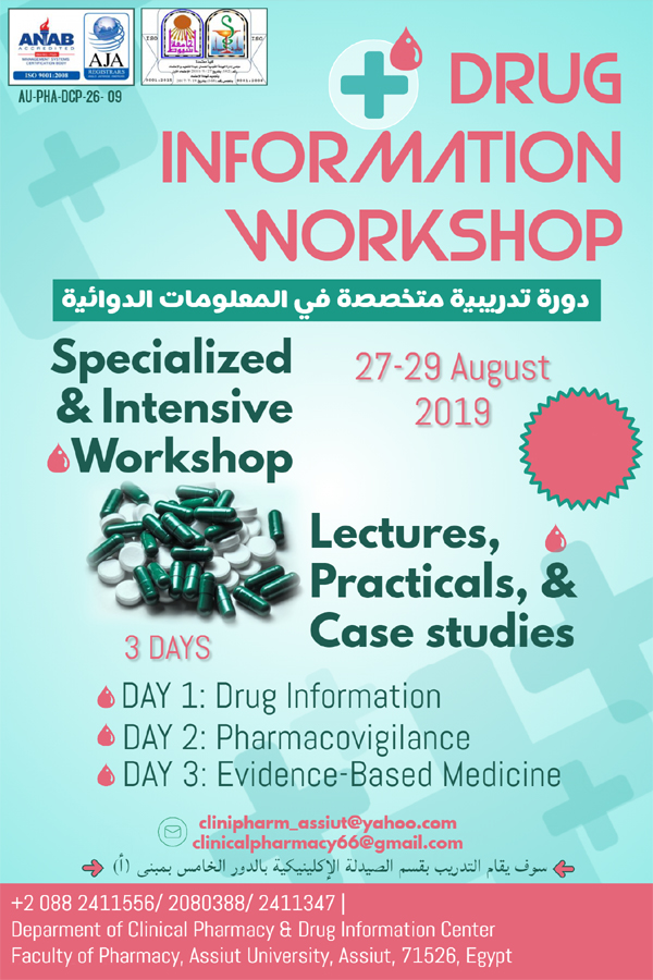 للطلاب والخريجين .. سيتم عقد دورة تدريبية متخصصة في المعلومات الدوائية بكلية الصيدلة في الفترة من 27-29 أغسطس 2019م. 26 أغسطس 2019 للطلاب والخريجين .. سيتم عقد دورة تدريبية متخصصة في المعلومات الدوائية بكلية الصيدلة في الفترة من 27-29 أغسطس 2019م.