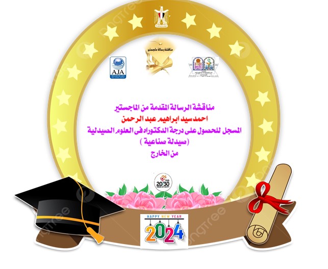 مناقشة الرسالة المقدمة من الماجستير / احمد سيد ابراهيم عبد الرحمن - المسجل للحصول على درجة الدكتوراه فى العلوم الصيدلية (صيدلة صناعية ) من الخارج يوم الخميس الموافق 11 يناير 2024
