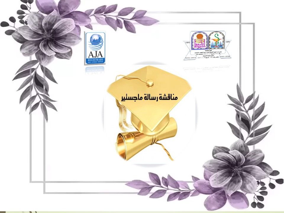 مناقشة رسالـة الماجستير المقدمة من الصيدلانية/ دعاء فهد عبدالغنى المسجلة على درجة الماجستير في العلوم الصيدلية (صيدلة صناعية) (من الخارج) يـوم الأربعاء الموافق 23 مارس 2022م في تمام الساعـة الواحدة ظهراً