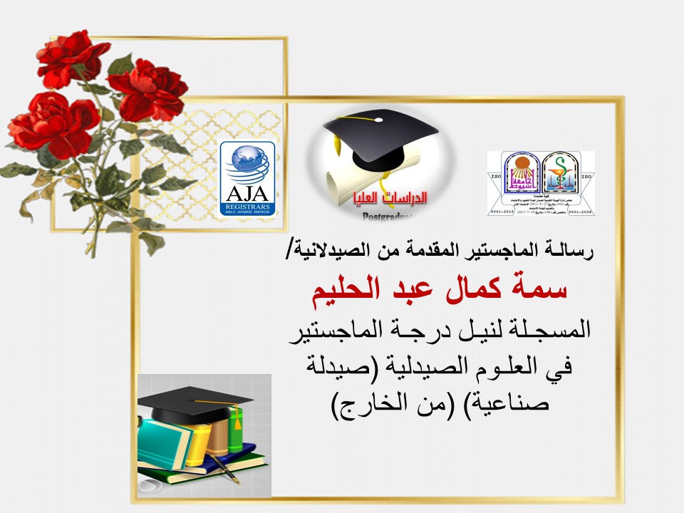 مناقشة رسالـة الماجستير المقدمة من الصيدلانية/ سمة كمال عبد الحليم - المسجـلة لنيـل درجـة الماجستير في العلـوم الصيدلية (الصيدلة الصناعية) (من الخارج) يوم الخميس الموافق 2022/9/29 الساعة الثانية عشر صباحا