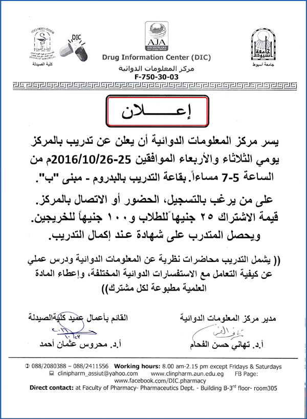 مركز المعلومات الدوائية بكلية الصيدلة يعلن عن دورة تدريبية للطلاب والخريجين يومي الثلاثاء والأربعاء 25-26 أكتوبر 2016م. 24 أكتوبر 2016 مركز المعلومات الدوائية بكلية الصيدلة يعلن عن دورة تدريبية للطلاب والخريجين يومي الثلاثاء والأربعاء 25-26 أكتوبر 2016م.