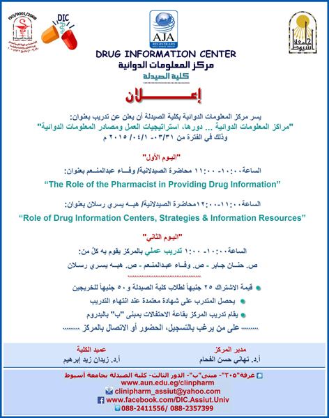 مركز المعلومات الدوائية بكلية الصيدلة يعلن عن تدريب بعنوان "مراكز المعلومات الدوائية ... دورها ، استراتيجيات العمل ومصادر المعلومات الدوائية" في الفترة 31/3-1/4/2015م.