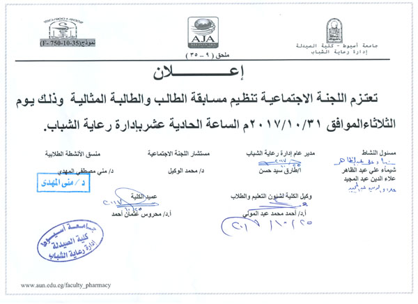 مسابقة الطالب المثالي والطالبة المثالية بكلية الصيدلة يوم الثلاثاء الموافق 31-10-2017م. 25 أكتوبر 2017 مسابقة الطالب المثالي والطالبة المثالية بكلية الصيدلة يوم الثلاثاء الموافق 31-10-2017م.
