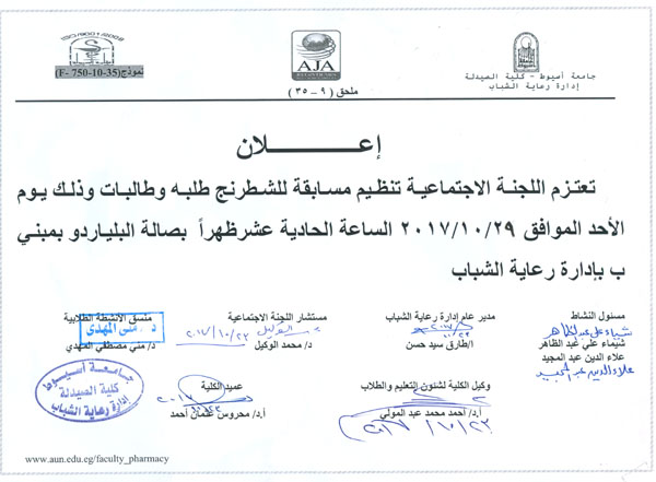 مسابقة للشطرنج طلبة وطالبات بكلية الصيدلة يوم الأحد الموافق 29-10-2017م. 25 أكتوبر 2017 مسابقة للشطرنج طلبة وطالبات بكلية الصيدلة يوم الأحد الموافق 29-10-2017م.