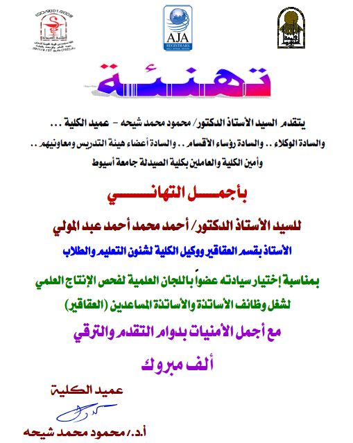 عميد كلية الصيدلة وأسرة الكلية يقدمون خالص التهنئة للسيد الأستاذ الدكتور: أحمد محمد أحمد عبد المولي بمناسبة إختيار سيادته عضواً باللجان العلمية لفحص الإنتاج العلمي لشغل وظائف الأساتذة والأساتذة المساعدين (العقاقير).