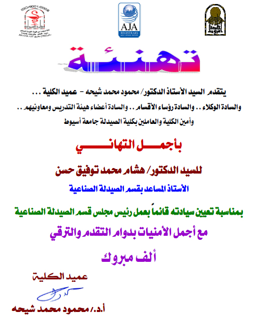 عميد كلية الصيدلة وأسرة الكلية يقدمون خالص التهنئة للسيد الدكتور: هشام محمد توفيق بمناسبة تعيين سيادته قائماً بعمل رئيس مجلس قسم الصيدلة الصناعية بكلية الصيدلة.