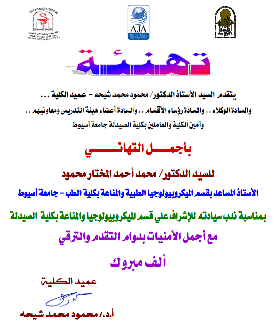 عميد كلية الصيدلة وأسرة الكلية يقدمون خالص التهنئة للسيد الدكتور: محمد أحمد المختار محمود بمناسبة ندب سيادته للإشراف علي قسم الميكروبيولوجيا والمناعة بكلية الصيدلة.