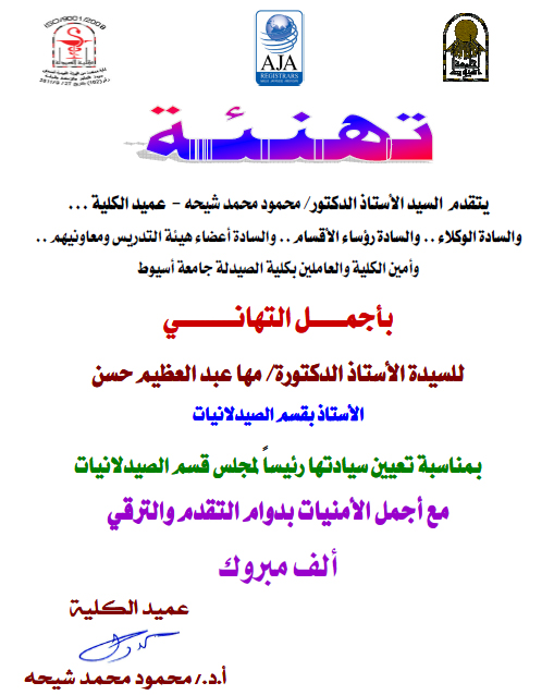 عميد كلية الصيدلة وأسرة الكلية يقدمون خالص التهنئة للسيدة الأستاذ الدكتورة: مها عبد العظيم حسن بمناسبة تعيين سيادتها رئيساً لمجلس قسم الصيدلانيات بكلية الصيدلة.