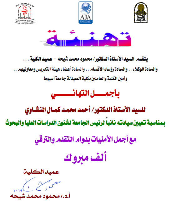 عميد كلية الصيدلة وأسرة الكلية يتقدمون بخالص التهنئة للسيد الأستاذ الدكتور: أحمد محمد كمال المنشاوي بمناسبة تعيين سيادته نائباً لرئيس جامعة أسيوط لشئون الدراسات العليا والبحوث.