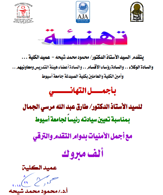 عميد كلية الصيدلة وأسرة الكلية يتقدمون بخالص التهنئة للسيد الأستاذ الدكتور: طارق عبد الله مرسي الجمال بمناسبة تعيين سيادته رئيساً لجامعة أسيوط. 26 أغسطس 2018 عميد كلية الصيدلة وأسرة الكلية يتقدمون بخالص التهنئة للسيد الأستاذ الدكتور: طارق عبد الله مرسي الجمال بمناسبة تعيين سيادته رئيساً لجامعة أسيوط.