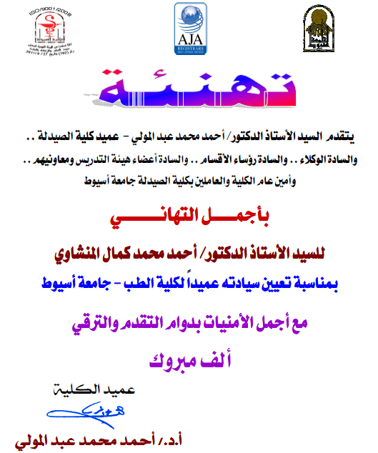 عميد كلية الصيدلة يهنئ السيد الأستاذ الدكتور: أحمد محمد كمال المنشاوي بمناسبة تعيين سيادته عميداً لكلية الطب - جامعة أسيوط. 26 نوفمبر 2017 عميد كلية الصيدلة يهنئ السيد الأستاذ الدكتور: أحمد محمد كمال المنشاوي بمناسبة تعيين سيادته عميداً لكلية الطب - جامعة أسيوط.
