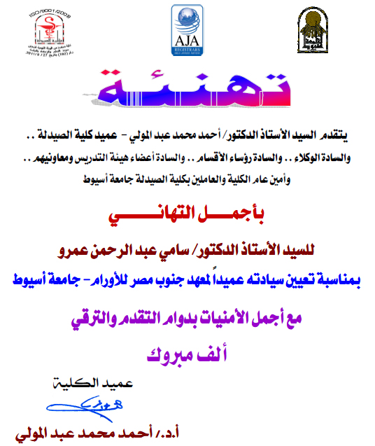 عميد كلية الصيدلة يهنئ السيد الأستاذ الدكتور: سامي عبد الرحمن عمرو بمناسبة تعيين سيادته عميداً لمعهد جنوب مصر للأورام - جامعة أسيوط. 26 نوفمبر 2017 عميد كلية الصيدلة يهنئ السيد الأستاذ الدكتور: سامي عبد الرحمن عمرو بمناسبة تعيين سيادته عميداً لمعهد جنوب مصر للأورام - جامعة أسيوط.