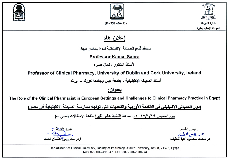 ندوة بقسم الصيدلة الإكلينيكية يحاضر فيها الأستاذ الدكتور/ كمال صبره يوم الخميس الموافق 19/1/2017م. 12 يناير 2017 ندوة بقسم الصيدلة الإكلينيكية يحاضر فيها الأستاذ الدكتور/ كمال صبره يوم الخميس الموافق 19/1/2017م.