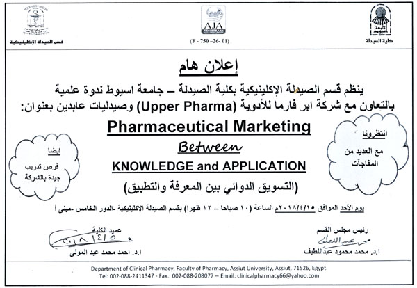 ندوة علمية ينظمها قسم الصيدلة الإكلينيكية بكلية الصيدلة مع شركة آبر فارما للأدوية وصيدليات عابدين يوم الأحد الموافق 15-4-2018م. 10 أبريل 2018 ندوة علمية ينظمها قسم الصيدلة الإكلينيكية بكلية الصيدلة مع شركة آبر فارما للأدوية وصيدليات عابدين يوم الأحد الموافق 15-4-2018م.