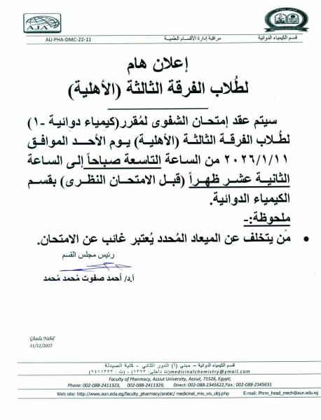 اعلان هام لطلاب الفرقة الثالة الجامعة الأهلية عقد امتحان الشفوى لمقرر كيمياء دوائية-1 يوم الأحد الموافق 11 يناير 2026