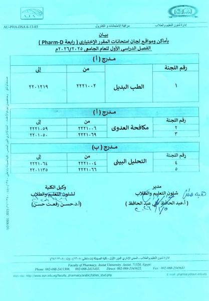 بيان بأماكن ومواقع لجان امتحانات المقرر الاختياري رابعة Pharm - D الفصل الدراسي الأول للعام الجامعى 2025/2026