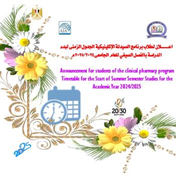 اعـــــــلان لطلاب برنامج الصيدلة الإكلينيكية الجدول الزمنى لبدء الدراسة بالفصل الصيفي للعام الجامعى 2025/2024م