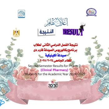 نتيجة الفصل الدراسي الثانى لطلاب برنامج بكالوريوس الصيدلة فارم دى (صيدلة اكلينيكية ) للعام الجامعى 2025/2024