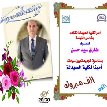 أسرة كلية الصيدلة تتقدم بخالص التهانى للسيد/طارق سيد حسن - بمناسبة تجديد تعيين سيادته - أمين كلية الصيدلة