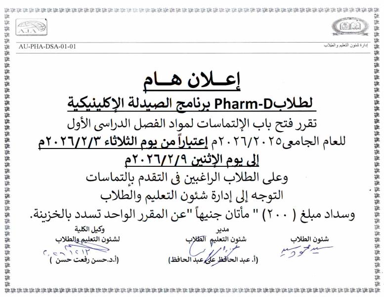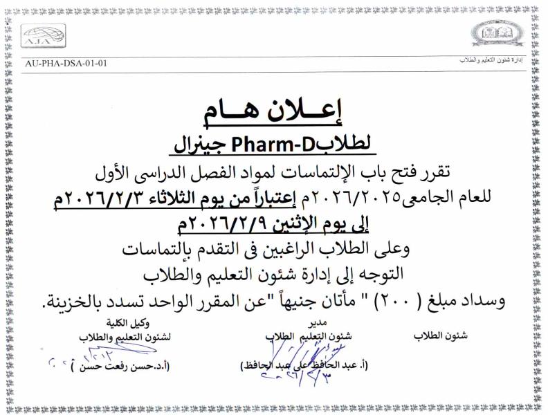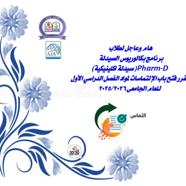 هام وعاجل لطلاب برنامج بكالوريوس الصيدلة Pharm-D( صيدلة اكلينيكية) تقرر فتح باب الإلتماسات لمواد الفصل الدراسي الأول للعام الجامعى 2025/2026
