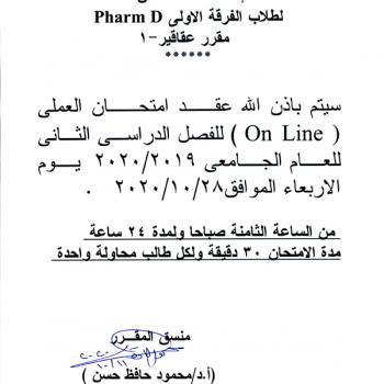 سوف يعقد بمشيئة الله تعالي اجتماع مجلس كلية الصيدلة يوم الاثنين الموافق 19-10-2020م الساعة الحادية عشر صباحاً…
