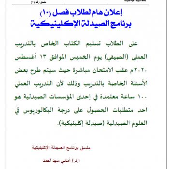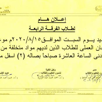 سوف يعقد بمشيئة الله تعالي اجتماع لجنة شئون التعليم والطلاب بكلية الصيدلة يوم الخميس الموافق 13-8-2020م الساعة الثانية…