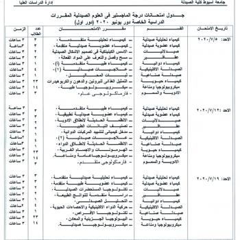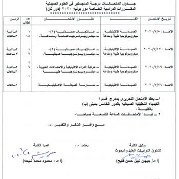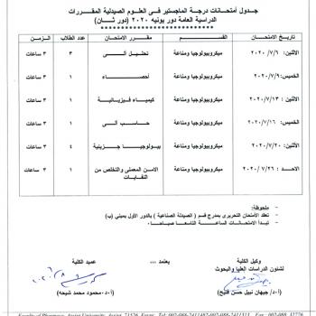 جدول امتحان درجة الماجستير في العلوم الصيدلية – المقررات الدراسية الخاصة – دور أول – يونيو 2020م.
