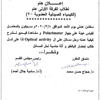 هام وعاجل لطلاب الفرقة الأولي عام .. مادة الكيمياء العضوية الصيدلية-2 .. سكشن عملي يوم الأحد…