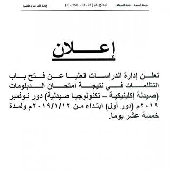 سوف يعقد بمشيئة الله تعالي اجتماع لجنة الدراسات العليا والبحوث بكلية الصيدلة يوم الاثنين الموافق 13-1-2020م الساعة…