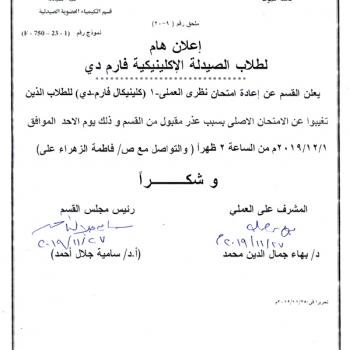هام لطلاب برنامج فارم دي (البرنامج العام) .. امتحان أعمال السنة بجزيئه يوم الثلاثاء الموافق 3-12-2019م ، وامتحان نظري العملي (2) شيت يوم الأربعاء الموافق 18-12-2019م.