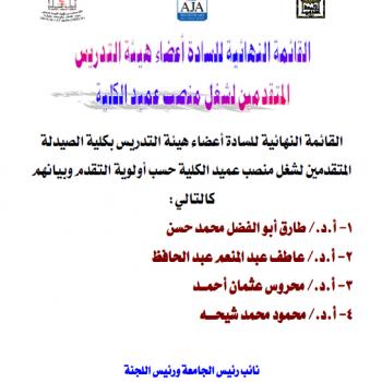 وافق مجلس كلية الصيدلة بجلسته رقم (638) المنعقدة بتاريخ 19/1/2017م والممتد حتى 23/1/2017م علي تعيين…