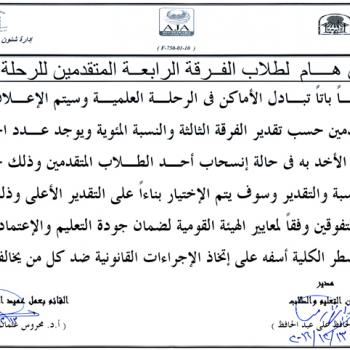 في إطار سعى الكلية لاستمرار تطبيق المواصفات القياسية لشهادة الأيزو 9001/2008 ، قد تحدد يوم الخميس 22/12/2016م لإجراء…