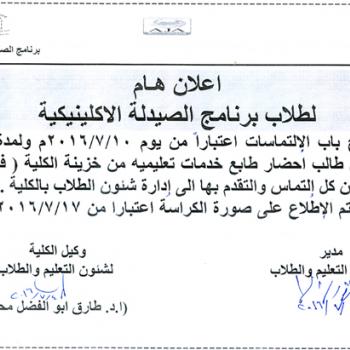 سوف يعقد بمشيئة الله تعالي اجتماع مجلس قسم الصيدلانيات بكلية الصيدلة رقم (423) وذلك يوم الاثنين الموافق 11/7/2016م الساعة…