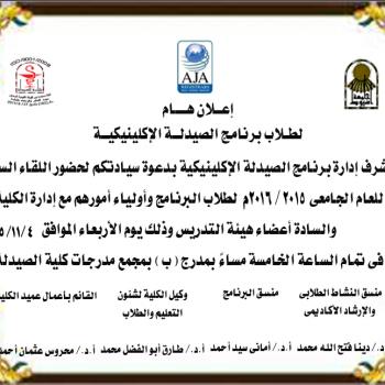 سوف يعقد بمشيئة الله تعالي اجتماع مجلس قسم العقاقير بكلية الصيدلة رقم (18) وذلك يوم الثلاثاء الموافق 10/11/2015م الساعة…