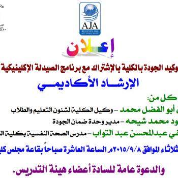 سوف يعقد بمشيئة الله تعالي اجتماع مجلس قسم الصيدلة الصناعية بكلية الصيدلة رقم (385) وذلك يوم الخميس الموافق 3/9/2015م الساعة الحادية عشر صباحاً بمكتب…